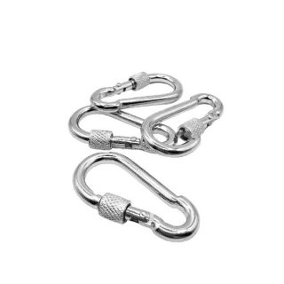 Карабин с фиксатором DIN 5299D предназначен для соединения цепей, тросов, канатов, других элементов такелажной оснастки. Этот крепеж позволяет в короткий срок произвести соединение двух отдельных отрезков гибкого такелажа. Классическая грушевидная форма позволяет одновременно цеплять несколько веревок или цепей. Фиксатор обеспечивает такелажу возможность многократного применения, предотвращает самопроизвольное расцепление карабина. Крепежное изделие чаще всего изготавливается из обычной или высокоуглеродистой стали, которую впоследствии подвергают гальваническому оцинкованию с целью получения прочного коррозионностойкого защитного покрытия.