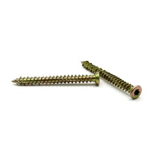 Шуруп по бетону нагель – самый распространенный вид самореза для бетона. Он имеет двухзаходную резьбу с переменной высотой в начале стержня, что облегчает монтаж. Он изготавливается в одном диаметре – 7.5 мм, длиной от 32 до 225 мм. Форма головки – потайная усеченная с зенкующими насечками и шлицем Torx (звездочка). Нагели применяются для крепления бруса, планок, оконных и дверных коробок, настенных предметов.