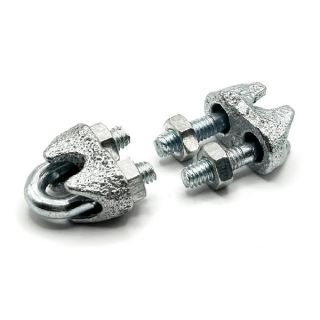 Зажимы для тросов стальных DIN741 и DIN 1142 - это комбинированные разъемные конструкции, включающие в себя кованое/литое/штампованное основание со сквозными отверстиями, куда продевается специальная U-образная гладкая скоба из стального прутка круглого сечения. Концы скобы снабжены метрической резьбой, служащей для наворачивания гаек шестигранных. Соединение тросов осуществляется путем вставки их концов в отверстие, образуемое скобой и основанием устройства, после чего гайки накрепко затягиваются, создавая высокое зажимное усилие. Размерные параметры зажимов определяются исходя из диаметра зажимаемого троса. Зажимы изготовлены из углеродистой оцинкованной стали.